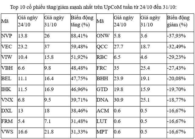 Trên UpCoM, cổ phiếu VEC có tuần thứ hai liên tiếp lọt top tăng cao nhất. Tổng cộng mã này liên tiếp tăng kịch trần từ phiên 23/10 đến 30/10, trước khi điều chỉnh giảm 8% trong phiên thứ Sáu. Tuần trước, cổ phiếu VEC tăng gần 28%.