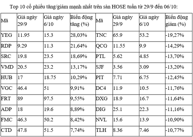 Trên sàn HOSE, phản ánh một tuần giao dịch đầy khó khăn và thận trọng, khi một nửa trong số các mã tăng chưa đạt tới 10%.