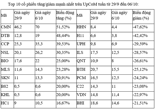 Trên UpCoM, diễn biến ở nhóm cổ phiếu tăng, giảm mạnh nhất khá ảm đạm, khi toàn bộ đều chỉ có thanh khoản rất thấp trong các phiên và không hiếm phiên còn trắng giao dịch ở nhiều cổ phiếu.