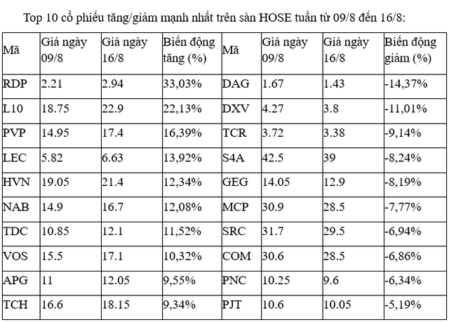 Trên sàn HOSE, cổ phiếu nhỏ, có tính đầu cơ cao là RDP đã tăng vọt và bỏ xa phần còn lại với cả năm phiên đều tăng, với ba phiên 13, 14 và 15/8 đều tăng kịch trần. Cổ phiếu này bật lên sau khi về vùng 2.200 đồng vào tuần trước, mức thấp nhất kể từ năm 2012 tới nay.