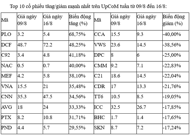 Trên UpCoM, phần lớn các mã tăng, giảm mạnh nhất đều thanh khoản thấp, ngoại trừ cổ phiếu CMM, nhưng khớp lệnh cũng trồi sụt, khi có phiên khớp được hơn 1 triệu đơn vị, nhưng có phiên chỉ hơn 40.000 cổ phiếu được sang tay.