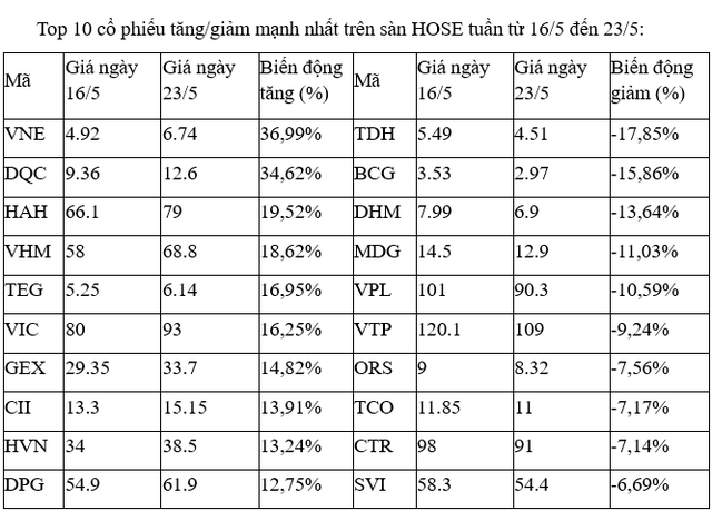 Trên sàn HOSE, nhóm các cổ phiếu tăng đáng chú nhất có sự góp mặt đáng chú ý của cặp đôi nhà Vingroup là VIC và VHM. Trong đó, VHM được mua bắt đáy mạnh sau khi thuộc nhóm mã giảm sâu nhất vào tuần trước đó dù chỉ mất gần 7%.