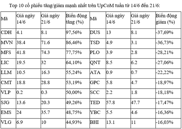 Trên UpCoM, cổ phiếu tăng mạnh nhất với gần 100% là CDH của CTCP Công trình công cộng Dịch vụ Du lịch Hải Phòng. Tổng cộng, cổ phiếu này đã có tám phiên liên tiếp tăng kịch trần gần nhất, nhưng khớp lệnh chỉ 100 đơn vị/phiên.