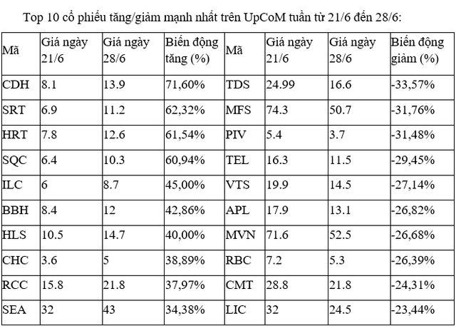 Tuần này, UpCoM chào đón tân binh TSA của CTCP Đầu tư và Xây lắp Trường Sơn, với phiên giao dịch đầu tiên vào 25/6 với giá tham chiếu 10.600 đồng và đã tăng hết biên độ +39,6%, khớp hơn 0,75 triệu đơn vị.