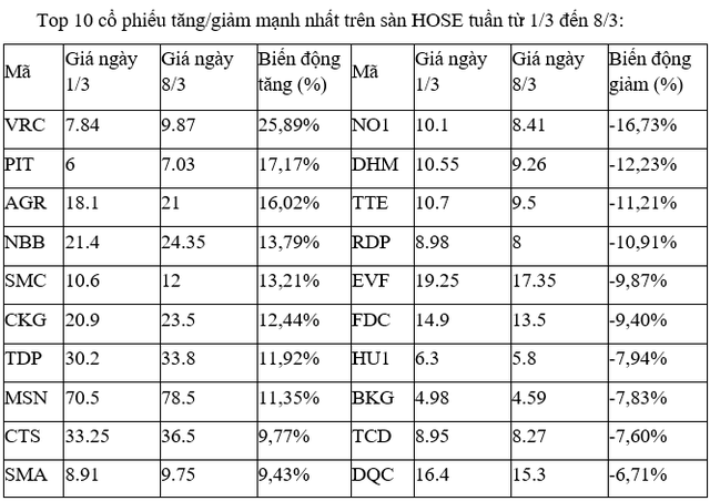 Ở chiều ngược lại, nhóm cổ phiếu NO1, RDP, EVF, FDC, DHM, BKG bị chốt lời và giảm khá mạnh. Trong đó, cổ phiếu DHM tuần trước đó còn thuộc top những mã tăng tốt nhất với mức tăng gần 19%.