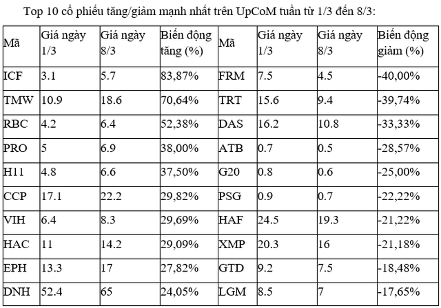 Trên UpCoM, đa phần các mã tăng, giảm mạnh nhất tuần này đều chỉ có thanh khoản yếu. Ngoại trừ ICF, khi là mã tăng vượt trội và thanh khoản ở mức trên dưới 0,4 triệu đơn vị/phiên. Tổng cộng, cổ phiếu này đã có 7 phiên liên tiếp gần nhất đều đóng cửa ở mức giá trần.