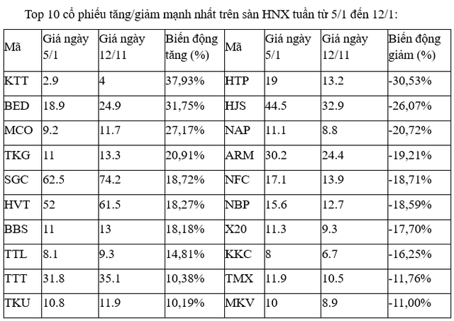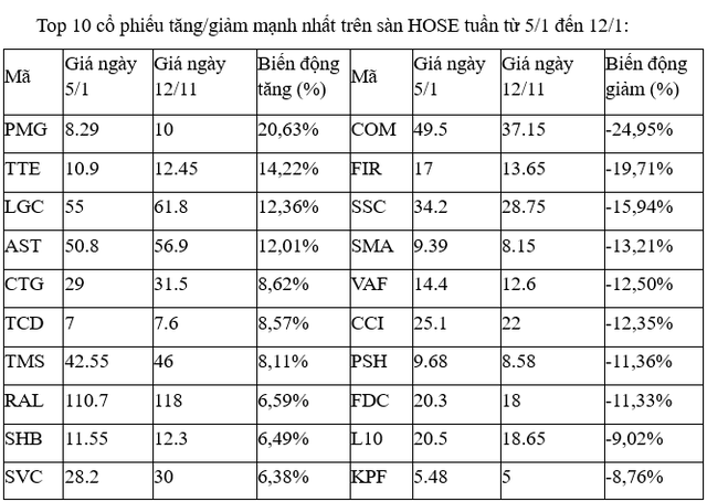 Trên sàn HOSE, phản ánh dòng tiền tập trung vào các mã ngân hàng thời gian gần đây, nhóm cổ phiếu tăng mạnh nhất tuần này đã có hai cái tên trong nhóm này góp mặt, đó là cổ phiếu ngân hàng SHB, dù chỉ tăng 6,5% nhưng mã này có phiên giao dịch ngày 10/1 với khối lượng khớp lệnh đạt kỷ lục khi có hơn 94,3 triệu đơn vị.