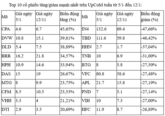Tuần này UpCoM chào đón tân binh AAH của CTCP Hợp Nhất trong phiên giao dịch đầu tiên vào 11/1 và cổ phiếu này đã có hai phiên tăng kịch trần. Giá cổ phiếu từ 9.000 đồng vọt lên 15.800 đồng, khớp lần lượt 0,47 triệu và 0,08 triệu đơn vị trong hai phiên.