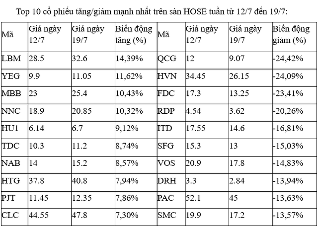 Ở chiều ngược lại, cổ phiếu HVN có tuần thứ hai liên tiếp lọt top giảm mạnh nhất sàn, dù tuần trước đó cổ phiếu này chỉ mất 5%. Phản ánh áp lực chốt lời gia tăng khi cổ phiếu này chạm mức cao nhất kể từ tháng 3/2018 tại hơn 37.000 đồng.