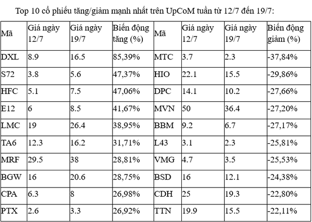 Trên UpCoM, các cổ phiếu tăng, giảm mạnh nhất tuần này tiếp tục giao dịch với thanh khoản thấp và không ít còn trắng giao dịch trong một số phiên.