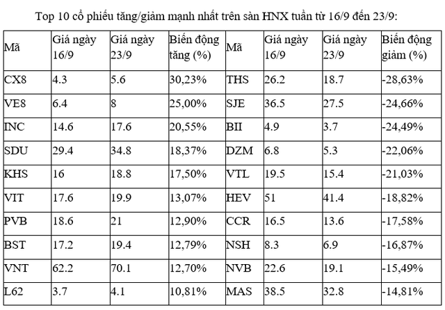 Chỉ số HNX-Index giảm 8,44 điểm (-3,09%) xuống 264,44 điểm. Giá trị giao dịch trên HNX giảm 10,5% so với tuần trước xuống 6.579 tỷ đồng, khối lượng giảm 5,5% xuống 317 triệu cổ phiếu.
