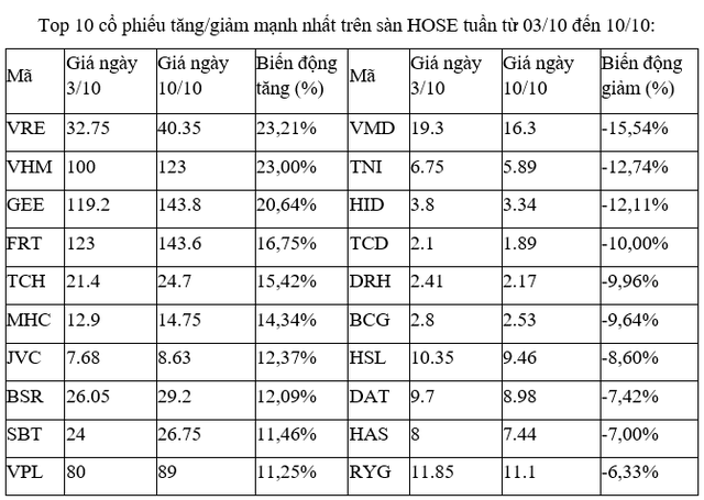 Top 10 cổ phiếu tăng/giảm mạnh nhất tuần: Nhóm nhà Vingroup vượt trội