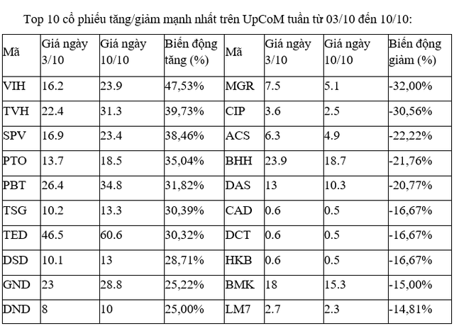 Trên UpCoM, các cổ phiếu tăng, giảm mạnh nhất tuần đều giao dịch ảm đạm, thanh khoản thấp, thậm chí nhiều mã còn trắng thanh khoản trong các phiên.