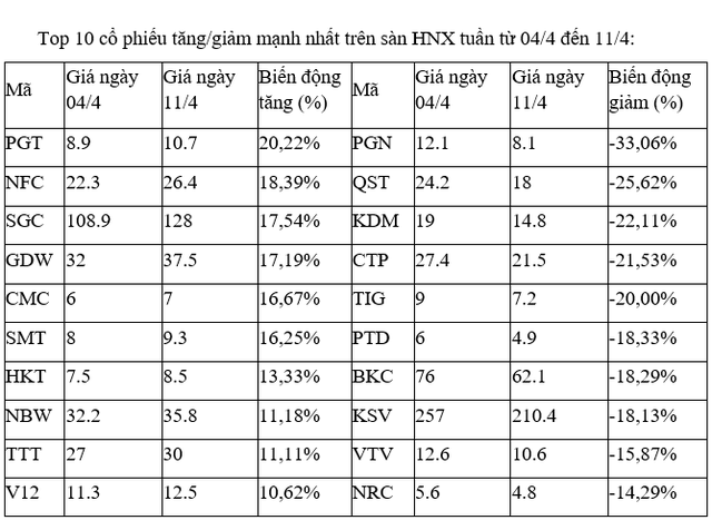 Trong khi đó, ở chiều ngược lại, một số cái tên chịu sức ép lớn ngay cả trong hai phiên hồi phục mạnh cuối tuần cũng chỉ ghi nhận mức tăng vừa phải, thậm chí chỉ nhích nhẹ như NRC, chỉ tăng 2% mỗi phiên sau khi giảm sàn liên tiếp trước đó vào 08/4 và 09/4.