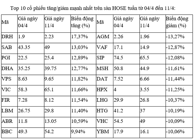 Trên sàn HOSE, với hai phiên biến động mạnh giảm đầu tuần và “trả điểm” trong hai phiên sau đó, thì các cổ phiếu tăng, giảm mạnh nhất cũng biến thiên theo và kết tuần tổng kết chỉ dừng lại ở quanh ngưỡng 10%.