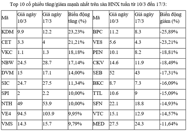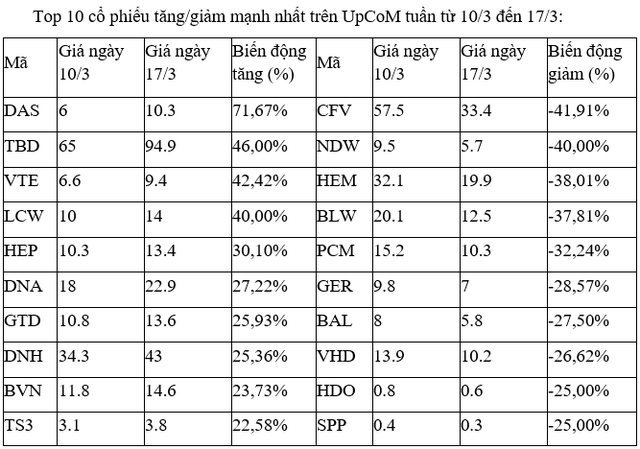 Trên UpCoM, nhóm cổ phiếu tăng, giảm mạnh nhất tuần không có diễn biến đáng kể nào, khi chỉ có giao dịch thấp, thậm chí trắng thanh khoản một số phiên trong tuần.