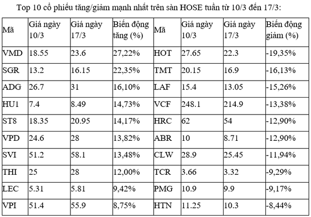 Trên sàn HOSE, cổ phiếu VMD và SGR tăng mạnh nhất, nhưng thanh khoản hai mã này tương đối thấp, chỉ vài chục nghìn đơn vị khớp lệnh trung bình trong các phiên giao dịch.