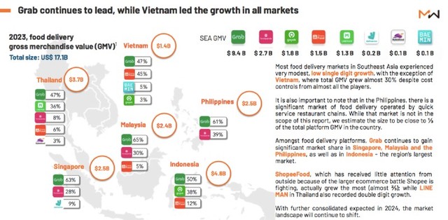 Tuy nhiên, nếu xét về tốc độ tăng trưởng, Việt Nam là thị trường giao đồ ăn có mức tăng trưởng ấn tượng nhất, lên tới 30%, trong khi hầu hết các thị trường khác chỉ ghi nhận tốc độ tăng trưởng một con số.