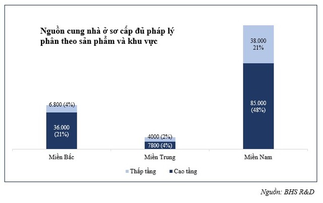 Căn cứ theo Điều 55 Luật Kinh doanh bất động sản năm 2014 quy định về Điều kiện của bất động sản hình thành trong tương lai được đưa vào kinh doanh, đại diện BHS R&D cho biết, số lượng sản phẩm nhà ở sơ cấp đủ pháp lý bán hàng theo quy định của pháp luật chiếm 87%, tương đương gần 178.000 căn. Trong đó, các sản phẩm chung cư chiếm tới hơn 72%, tức khoảng 129.000 căn hộ, còn lại khoảng 49.000 sản phẩm là thấp tầng.