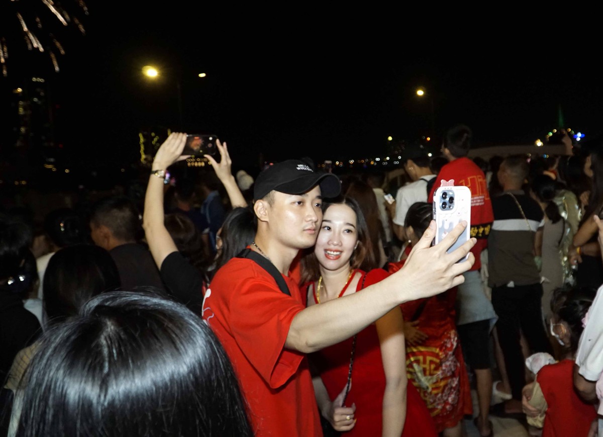 Bên cạnh việc ngắm trực tiếp, nhiều người không quên lấy điện thoại để quay lại thời khắc giao thừa.