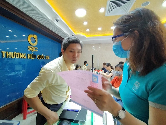 Khách hàng mua nữ trang, nhờ nhân viên SJC kiểm tra phiếu mua hàng.