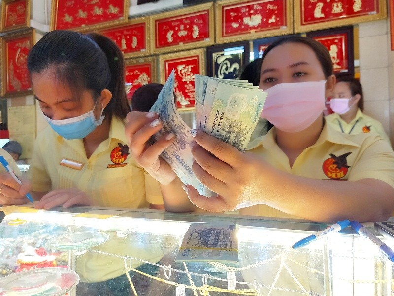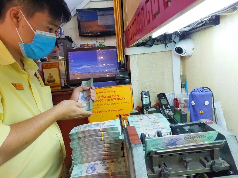 Nhân viên Mi Hồng đếm tiền sau khi bán vàng cho khách.