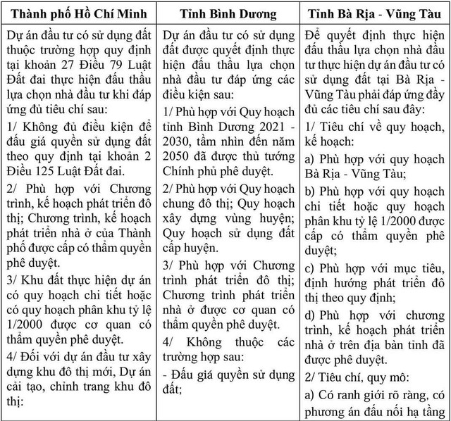 Theo tờ trình, trước khi sáp nhập, HĐND TP.HCM, Bình Dương và Bà Rịa - Vũng Tàu đã ban hành quy định các tiêu chí để quyết định thực hiện đấu thầu lựa chọn nhà đầu tư thực hiện dự án đầu tư có sử dụng đất.