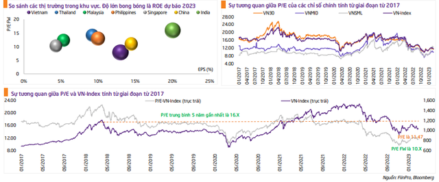 Khi so với các quốc gia trong khu vực, thị trường chứng khoán Việt Nam cũng đang hết sức hấp dẫn với P/E forward 2023 ở mức thấp, nhưng lại có mức ROE thuộc nhóm cao nhất. Chính vì vậy, các chuyên gia đánh giá, đây là thời điểm hợp lý để tích lũy những cổ phiếu có nội tại tốt hoặc kết quả kinh doanh vẫn đạt mức ổn định trong năm 2023.