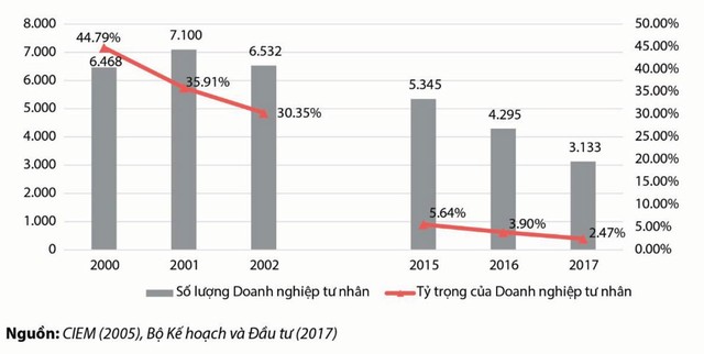 Số lượng và tỷ trọng doanh nghiệp tư nhân trong tổng số doanh nghiệp đăng ký hàng năm vào đầu những năm 2000 và những năm gần đây.