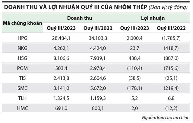 Đối với hai doanh nghiệp sản xuất thép khác là Công ty cổ phần Thép Pomina (mã chứng khoán POM) và Công ty cổ phần Gang thép Thái Nguyên (mã chứng khoán TIS), quý III cũng như 9 tháng đầu năm 2023 ghi nhận thua lỗ. Thép Pomina lỗ 110,4 tỷ đồng trong quý III (kinh doanh dưới giá vốn), luỹ kế 9 tháng đầu năm lỗ 647,4 tỷ đồng (cùng kỳ lỗ 707,5 tỷ đồng); Gang thép Thái Nguyên lỗ 58,5 tỷ đồng trong quý III, luỹ kế 9 tháng đầu năm lỗ 194,7 tỷ đồng (cùng kỳ lãi 7,9 tỷ đồng).