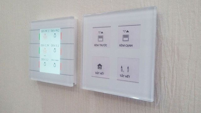 Đầu tiên, anh Long giới thiệu cho phóng viên chiếc phím bấm gắn tường cảm ứng bằng kính đầy sang trọng, chỉ với các phím bấm nhỏ bé, đã có thể điều khiển đến 12 chức năng. Nào là bật tắt đèn, đóng mở rèm cửa, điều khiển điều hòa, âm thanh, các ngữ cảnh… Không những thế, các chức năng còn được hiển thị trực quan trên một màn hình LCD. Cả với phóng viên, người tiếp xúc lần đầu cũng thao tác dễ dàng.