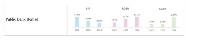 Ngân hàng mở rộng sang các thị trường ASEAN như Việt Nam và Indonesia, tận dụng kênh số để phát triển cho vay SME và bán lẻ. Nhờ kiểm soát chi phí nghiêm ngặt và tăng trưởng kênh số, Public Bank duy trì tỷ lệ chi phí trên thu nhập ở mức 32,6%, thấp nhất khu vực, còn ROA và ROE ổn định.