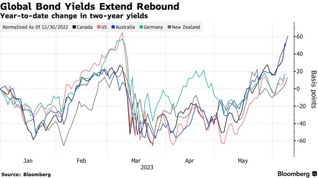 Lợi suất trái phiếu Chính phủ Mỹ kỳ hạn ngắn tăng lên gần mức cao nhất kể từ tháng 3/2023. Lợi suất trái phiếu cùng loại của Australia cũng lên mức cao nhất trong hơn một thập kỷ qua.
