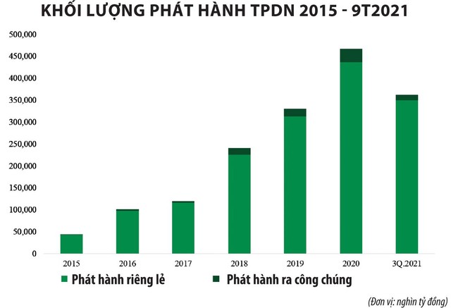 Theo Hiệp hội Thị trường trái phiếu Việt Nam (VBMA), trong 9 tháng đầu năm 2021 có tổng cộng 599 đợt phát hành trái phiếu doanh nghiệp trong nước, trong đó có 582 đợt phát hành riêng lẻ với tổng giá trị 350.000 tỷ đồng (chiếm 91% tổng giá trị phát hành), 14 đợt phát hành ra công chúng giá trị 12.000 tỷ đồng (chiếm 3% tổng giá trị phát hành) và 3 đợt phát hành trái phiếu ra thị trường quốc tế tổng giá trị 1 tỷ USD.