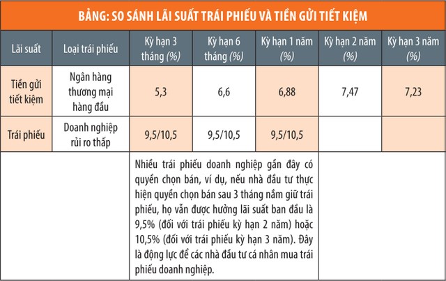 Gần đây, các nhà đầu tư cá nhân xuất hiện nhiều hơn, ước tính chiếm 10 - 15% trong tổng thị trường trái phiếu doanh nghiệp. Sức hút của trái phiếu doanh nghiệp gia tăng nhờ lợi tức được cải thiện do không ít trái phiếu được phát hành với quyền lựa chọn bán lại; nhà đầu tư cá nhân có thể bán lại trái phiếu cho doanh nghiệp phát hành sau một vài tháng nắm giữ mà vẫn hưởng được lợi nhuận như lãi suất cuống phiếu ban đầu. Ðây là một lựa chọn hấp dẫn so với sản phẩm tiền gửi tiết kiệm tại ngân hàng (xem Bảng).