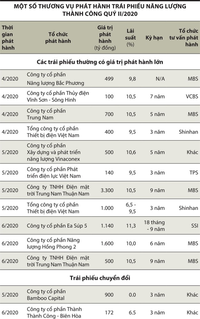 Đáng chú ý trong số này là hệ thống Trung Nam huy động tới 4.500 tỷ đồng, lãi suất 10,5%/năm, với tổ chức tư vấn phát hành là MBS. Năng lượng Hồng Phong 2 huy động 1.600 tỷ đồng, kỳ hạn 6 năm, lãi suất 10%/năm cũng do MBS tư vấn. Hay Ea Súp 5 phát hành 1.140 tỷ đồng, lãi suất 11,3%/năm, kỳ hạn 18 tháng đến 9 năm, do SSI tư vấn.