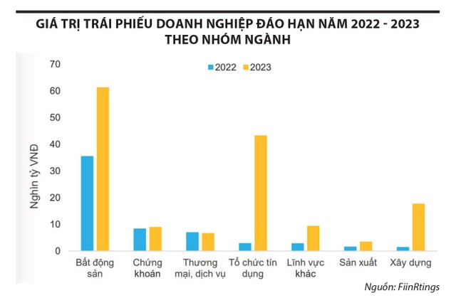 Chỉ tính riêng ngành bất động sản đã chiếm 59% tổng giá trị trái phiếu đáo hạn, tính riêng trong năm 2022 là 35.560 tỷ đồng và sang năm là 61.370 tỷ đồng. Các con số này giảm đáng kể so với trước nhờ hoạt động mua lại, song áp lực đảo nợ vẫn lớn.