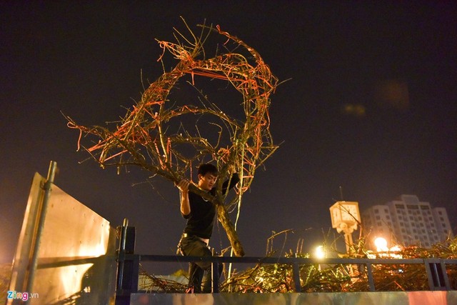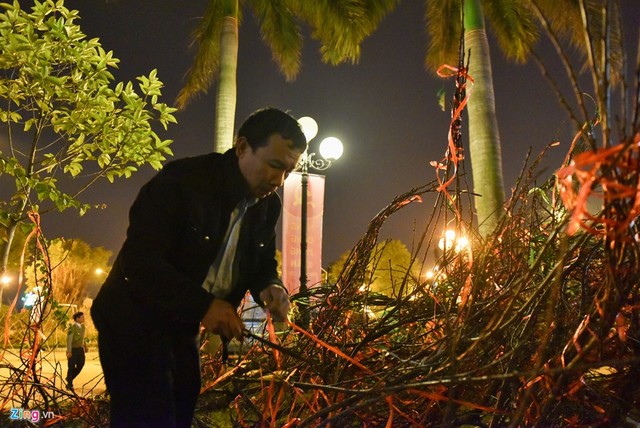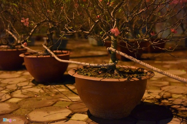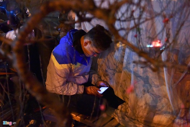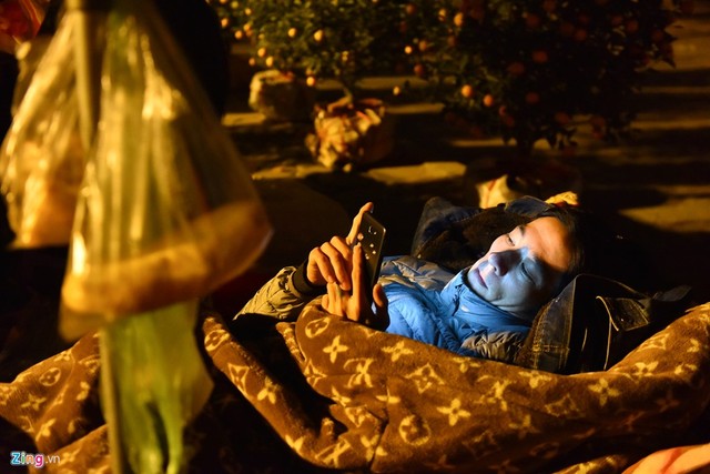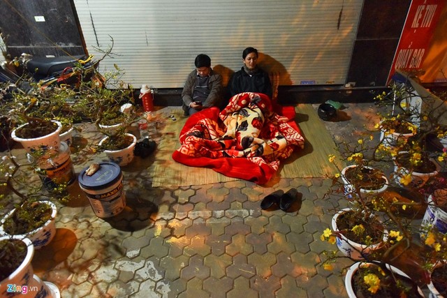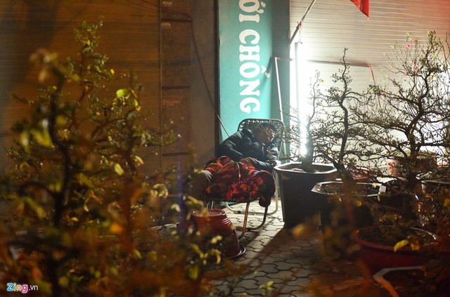 Mặc cho cái lạnh của đêm đông Hà Nội, những người bán đào, quất tại đường Lạc Long Quân vẫn phải thay nhau thức để trông coi tài sản tiền tỷ của mình.