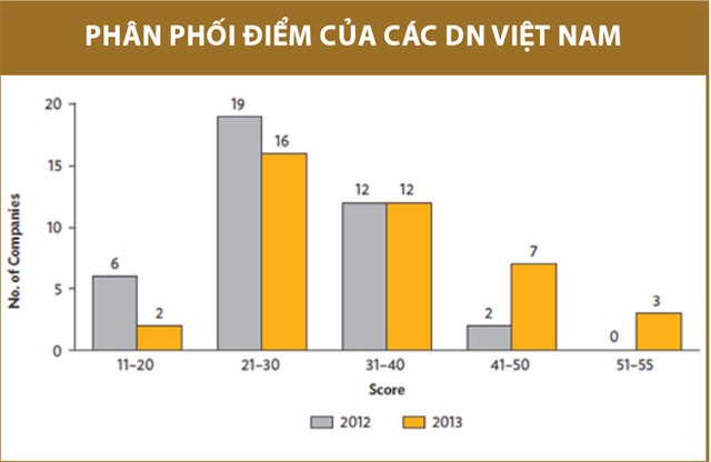 Tuy nhiên, trong 33 công ty được xem xét trong cả hai năm 2012 và 2013, các công ty này đã chuyển từ khung điểm thấp hơn sang khung điểm cao hơn, đặc biệt có 3 công ty ghi được mức điểm trên 50. Đây là những dấu hiệu đáng khích lệ cho những cải tiến trong hoạt động QTCT của các DN Việt, nhất là sau khi Thông tư 121/2012/TT-BTC về QTCT áp dụng cho công ty đại chúng và Thông tư 52/2012/TT-BTC về công bố thông tin trên TTCK được ban hành.