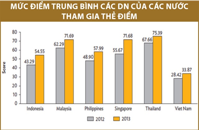 Hầu hết DN trong tổng số 40 DN Việt tham gia đánh giá có mức điểm dưới 50. Điều này cho thấy, các công ty vẫn còn tụt hậu so với chuẩn mực QTCT của khu vực.