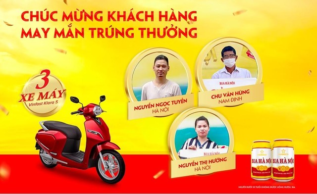Ngoài ra, 3 Giải Nhì của chương trình là xe máy điện Vinfast KlaraS và hàng chục Giải Ba mỗi giải 1 chiếc điện thoại Vsmart Aris Pro cũng đã được trao tận tay những chủ nhân may mắn. Hơn thế nữa, hàng trăm ngàn khách hàng trên toàn quốc cũng đã nhận được giải thưởng thẻ nạp điện thoại trị giá 20.000đ từ chương trình khuyến mại “Bừng Sắc Hè Cùng Bia Hà Nội”.