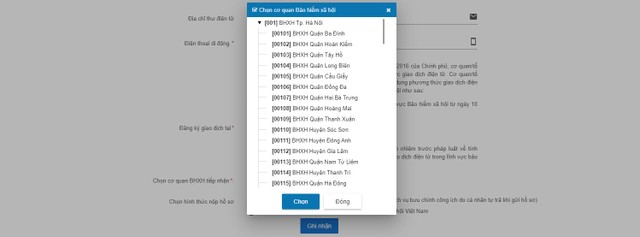 Tiếp đó, ấn vào phần "Chọn" để hiển thị danh sách cơ quan Bảo hiểm xã hội và lựa chọn cơ quan tiếp nhận hồ sơ.