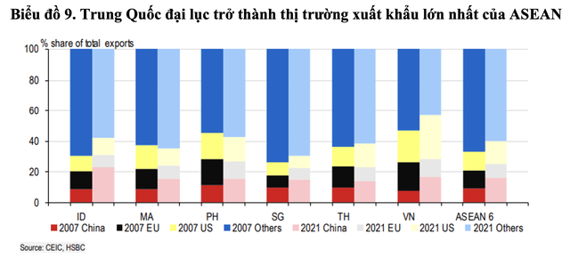 HSBC đã đưa ra một “bức tranh đa chiều” về tình hình xuất khẩu của ASEAN sang Trung Quốc trong năm 2022, với sự dẫn đầu là Indonesia, nước có xuất khẩu đã phục hồi toàn lực, tiếp theo là Việt Nam và Malaysia. Tuy nhiên, tại Singapore, Thái Lan và Philippines lại đi theo chiều hướng ngược lại, với xuất khẩu giảm tới 30% so với cùng kỳ trong hầu hết nửa sau năm 2022.