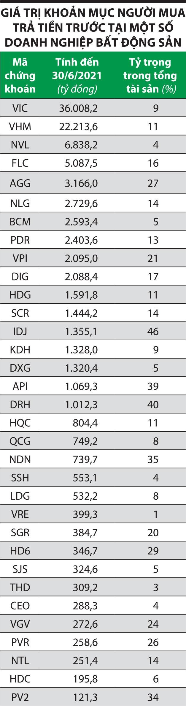 Thống kê cho thấy, thời điểm cuối quý II/2021, nhiều doanh nghiệp có giá trị khoản mục người mua trả tiền trước lên tới hàng ngàn tỷ đồng (đây là khoản tiền trả trước hay đặt cọc mua sản phẩm dự án, doanh nghiệp sẽ ghi nhận doanh thu khi hoàn thành bàn giao cho khách hàng).
