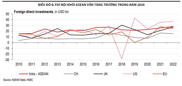 Tuy nhiên, khi ASEAN ngày càng phát triển theo chiều hướng đi lên, tự xây dựng được các công ty đẳng cấp thế giới, nhà đầu tư ở Đông Nam Á bắt đầu đầu tư ra bên ngoài nền kinh tế nội địa, hướng sang các nước trong khu vực ASEAN, dẫn đầu là Singapore, Thái Lan và Malaysia. Biểu đồ 7 cho thấy, FDI nội khối ASEAN đứng đầu các nguồn FDI trong phần lớn giai đoạn 2010 - 2019, chỉ gần đây mới bị Mỹ vượt qua. FDI nội khối ASEAN đã trở thành một nguồn vốn ổn định cho ASEAN, nguồn vốn này thậm chí vẫn tăng trưởng trong giai đoạn nặng nề nhất của đại dịch (Biểu đồ 8).