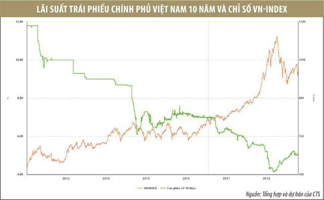 Nhìn trên biểu đồ “Lãi suất trái phiếu Chính phủ Việt Nam 10 năm và chỉ số VN-Index" có thể thấy mối tương quan nghịch giữa lãi suất trái phiếu Chính phủ và VN-Index. Khi lãi suất trái phiếu Chính phủ (đường màu xanh) giảm thì VN-Index tăng và ngược lại. Ở thời kỳ 2015 - 2016, VN-Index có xu hướng đi ngang khi lãi suất trái phiếu Chính phủ đi ngang.