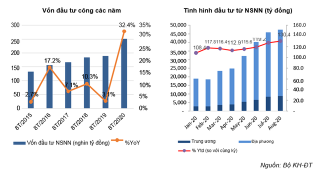 Để thực hiện mục tiêu đẩy nhanh tiến độ thực hiện chương trình đầu tư công, chi đầu tư phát triển tăng lên đến 221,7 nghìn tỷ đồng trong 8 tháng đầu năm 2020, tăng 41,4% so với cùng kỳ năm 2019.