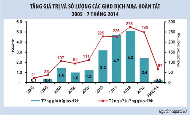 Xu hướng này có thể thấy rõ ràng hơn trong 7 tháng đầu năm 2014, với giao dịch M&A đã hoàn tất và tổng giá trị giao dịch xấp xỉ 200 triệu USD. Những tranh chấp vừa qua ở Biển Đông, dù có ảnh hưởng đến nhu cầu M&A tại Việt Nam của các nhà đầu tư từ Trung Quốc và Đài Loan, nhưng không phải là yếu tố chính giải thích cho việc đi xuống này của thị trường M&A, vì các nhà đầu tư từ Trung Quốc và Đài Loan không quá năng động trên thị trường M&A tại Việt Nam ngay cả những năm trước đây. Lý do chính cho việc đi xuống này vẫn là sự thiếu hụt các tài sản có chất lượng tốt và giá trị lớn được chào bán với giá hợp lý.