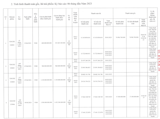 Cụ thể, đối với trái phiếu TD1CB2126002, mệnh giá 600 tỷ đồng, dư nợ còn lại 525 tỷ đồng và phát hành ngày 23/6/2021. Trong đó, ngày 30/1/2023, Công ty phải mua lại trước hạn gần 75 tỷ đồng. Tuy nhiên, Công ty thực tế thanh toán trong ngày 30/1/2023 và ngày 31/1/2023; đồng thời, ngày 4/5/2023 phải thanh toán 13,72 tỷ đồng tiền lãi, nhưng Công ty thanh toán vào ngày 4/5, 10/5 và 12/5/2023