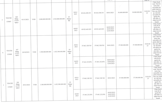 Và cuối cùng, đối với trái phiếu mã TD1CB2135010, phát hành ngày 27/9/2021, mệnh giá 750 tỷ đồng, dư nợ còn lại 716,25 tỷ đồng. Trong đó, ngày 30/1/2023 phải mua lại trước hạn 18,75 tỷ đồng nhưng thực tế là ngày 31/1/2023; đồng thời ngày 4/5/2023 phải trả lãi 18,72 tỷ đồng, nhưng thực tế thanh toán ngày 4/5, 10/5 và 12/5.